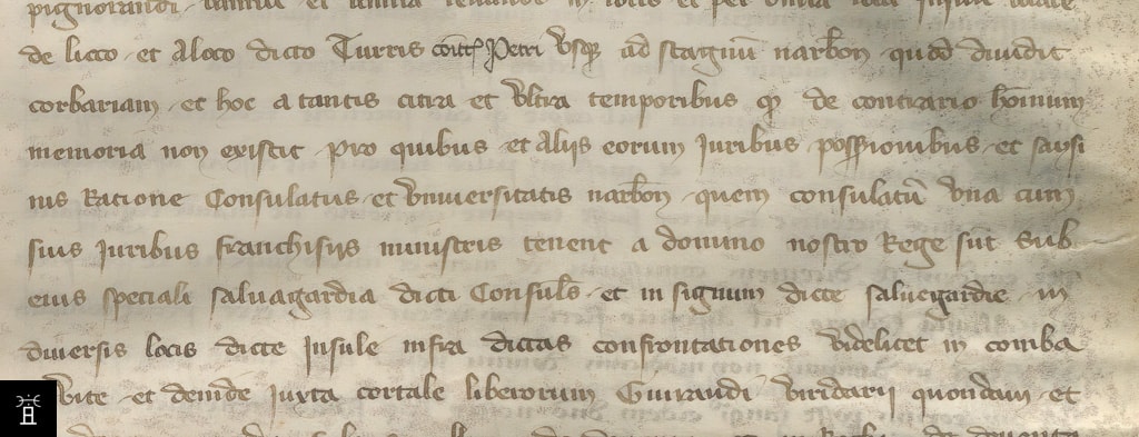 | 40 | vicecomitis Narbone et a domino judice ejusdem conficiendi publica instrumenta de notis non cancellatis scripsi vicomte de Narbonne, et par son juge, pour rédiger des instruments publics à partir de notes non annulées, j’ai écrit |
