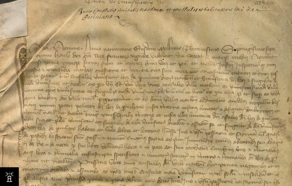 Le document présenté issu des Archives Communales de Narbonne est une expédition basée sur la minute notariale de 1221 et effectuée dans la seconde moitié du XIIIe siècle. Déchiffrer l'acte passe par l'analyse de l'écriture du scribe, la façon dont il écrit les lettres, les abréviations qu'il utilise.
