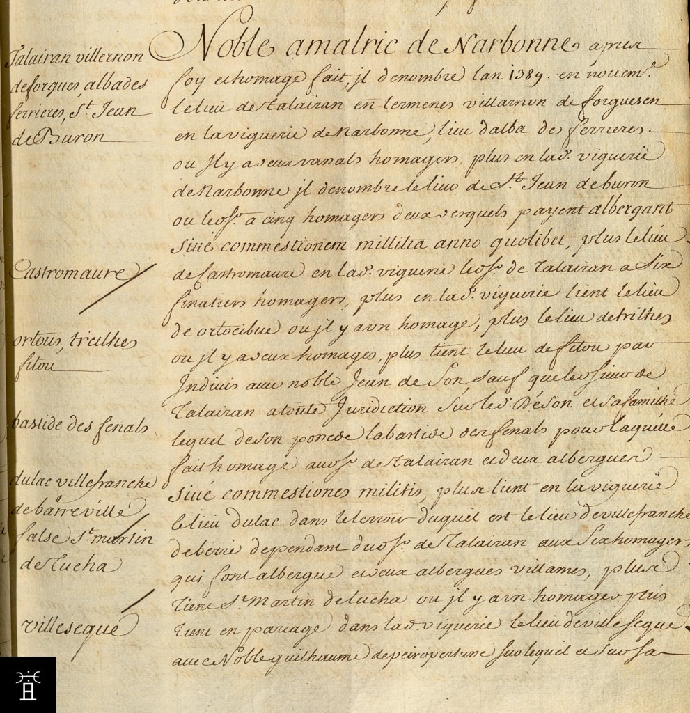 | 3 | -tate Recognoscimus vobis Guillermo Amalrici Bertrando de Bosco Bernardo Trenquerii Berengario Gau- -té Reconnaissons à vous Guillaume Amalric, Bertrand du Bois, Bernard Trenquier, Bérenger Gau- |