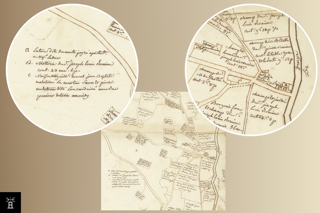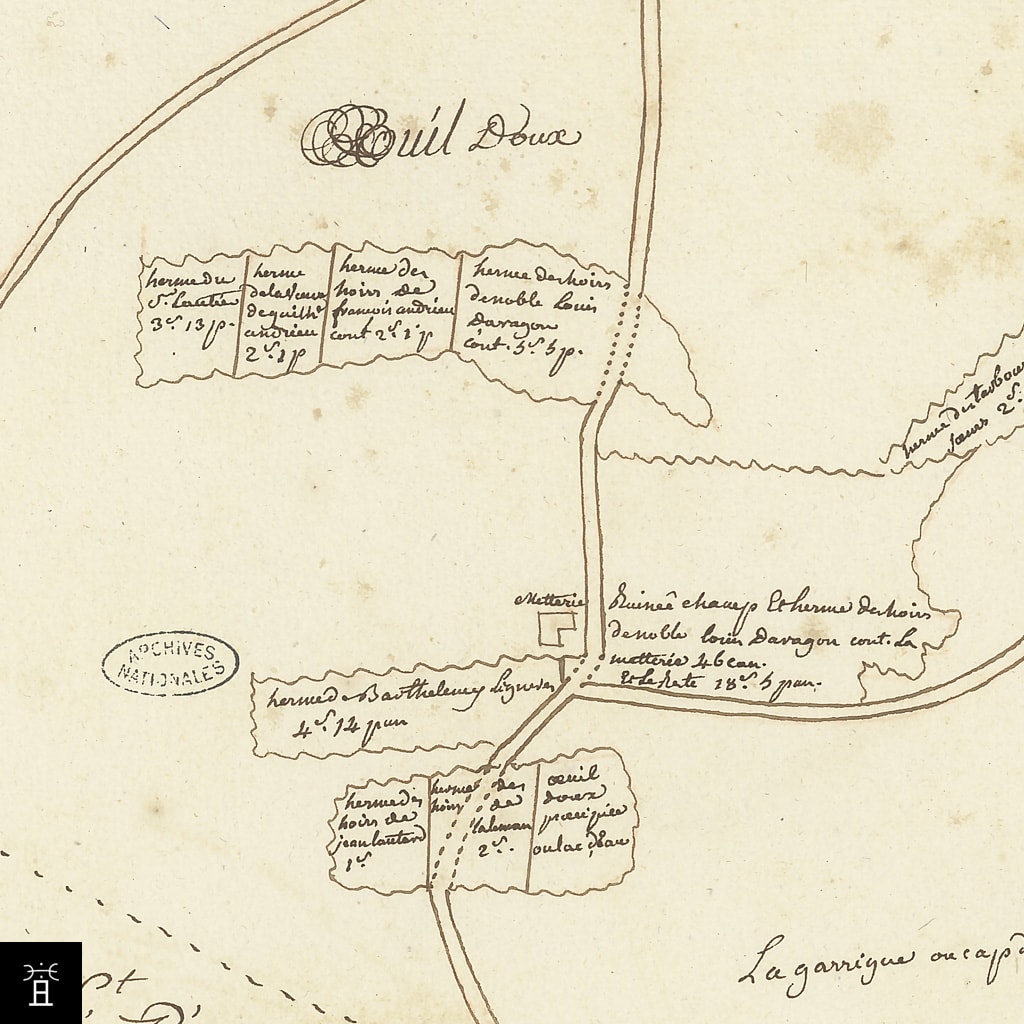 Les archives du XVIIIe siècle et le terrier de 1751 placent précisément la tour au sud de Mire Lestang, et la superposition terrier/cadastre grace aux limites parcellaires précise le lieu.