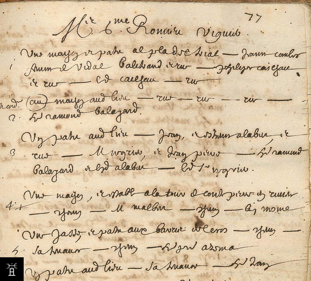 | 36 | de Lacu militum & B. V[i]naudi, Johannis Belaronis, cultorum, et Petri Raymundi de Bitterris, paratoris, et Guillermi du Lac chevaliers, & Bernard Mandi, Jean Belazoni agriculteurs, et Pierre Raymond de Béziers pareur, et Guillaume |