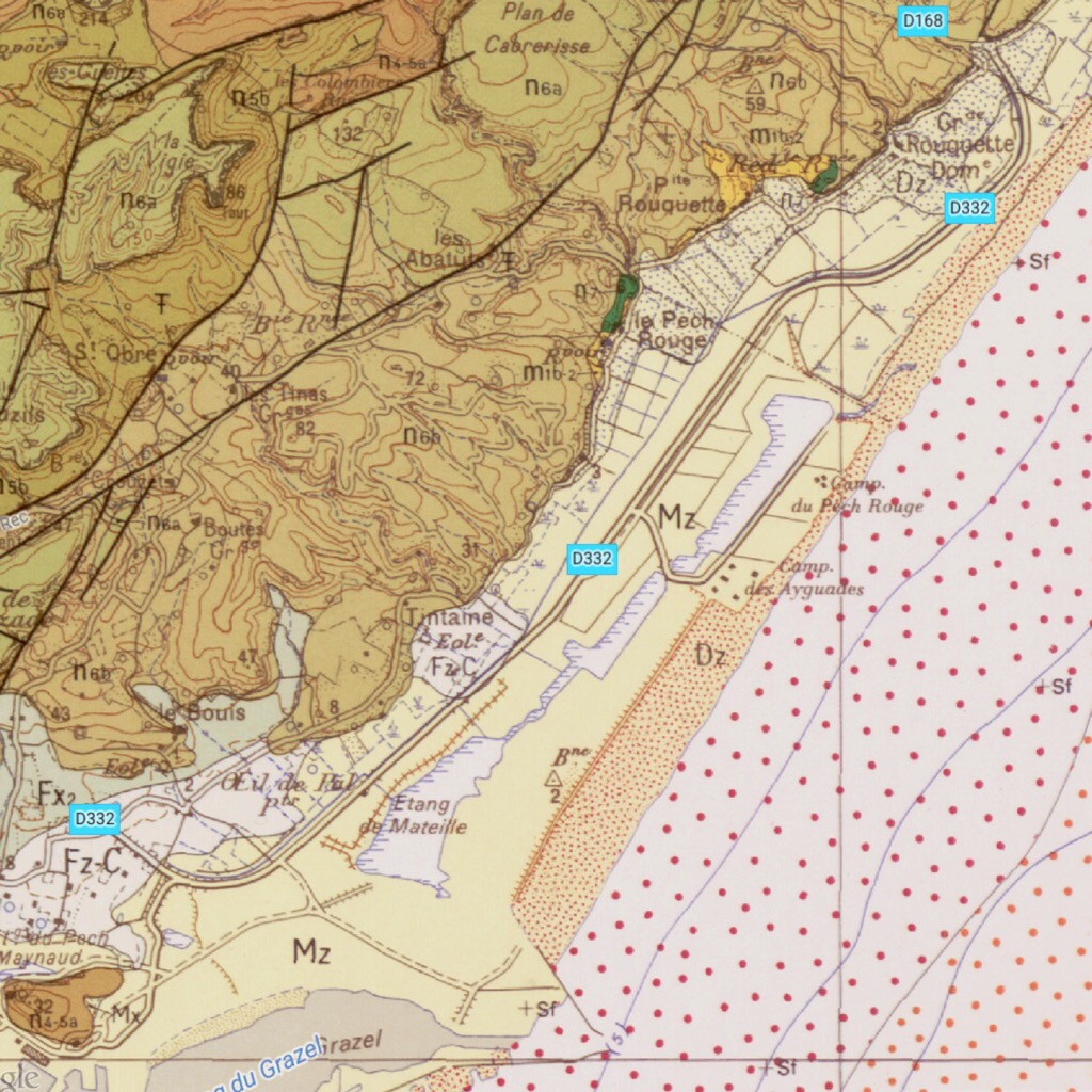 On peut encore observer les cordons littoraux anciens de sable coquillier du Quaternaire vers Pech Rouge et le Domaine de Grande Rouquette. Il existe aussi à ces endroits des poches de grés du Crétacé inférieur (Albien) et de marnes du Miocène moyen (Langhien).