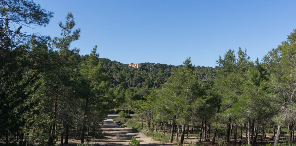 Le sentier baptisé «Allée des Naufragés», bordé de cyprès et de pins d'Alep, s'élève progressivement vers la Chapelle des Auzils.