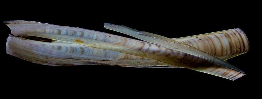 Valves caractérisées par la disposition radiale de ses bandes blanches et brunes et de ces côtes concentriques.