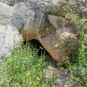 - Ce site est une petite grotte s'ouvrant à l'E-NE par un beau porche, face à la mer, à quelques centaines de mètres à peine de cette dernière. Elle comprend une unique salle longue de 12m pour une largeur moyenne de 4m, flanquée au Sud d'un petit locus long de 5m et large de 3m, de direction N-S qui donne à la grotte un plan général en angle droit.