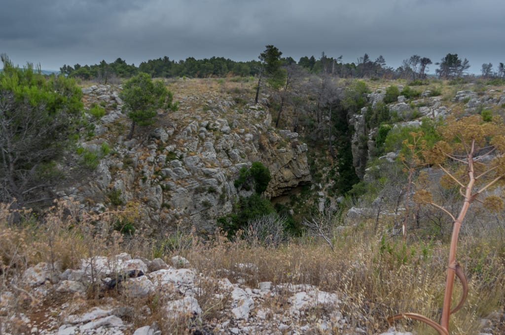 - Le fond des dolines est occupé par une riche végétation de feuillus bénéficiant d'un microclimat plus humide et contrastant avec les pineraies qui occupent les positions plus hautes. Ceci est du aux argiles de décalcification fertiles et imperméables qui retiennent localement l'eau.