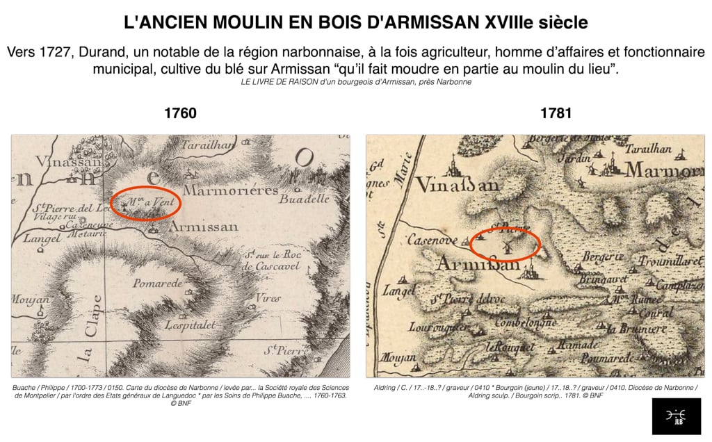 Dans le Livre de Raison (Registre de comptabilité domestique tenu par le père de famille comportant également des notations à caractère familial ou local) d'un bourgeois d'Armissan, il est fait référence à un moulin à vent en 1727. Cette existence est aussi confirmée sur les cartes de cette période, celle de Cassini le classant comme moulin en bois. Il n'est mentionné que sous le nom de moulin d'Armissan.