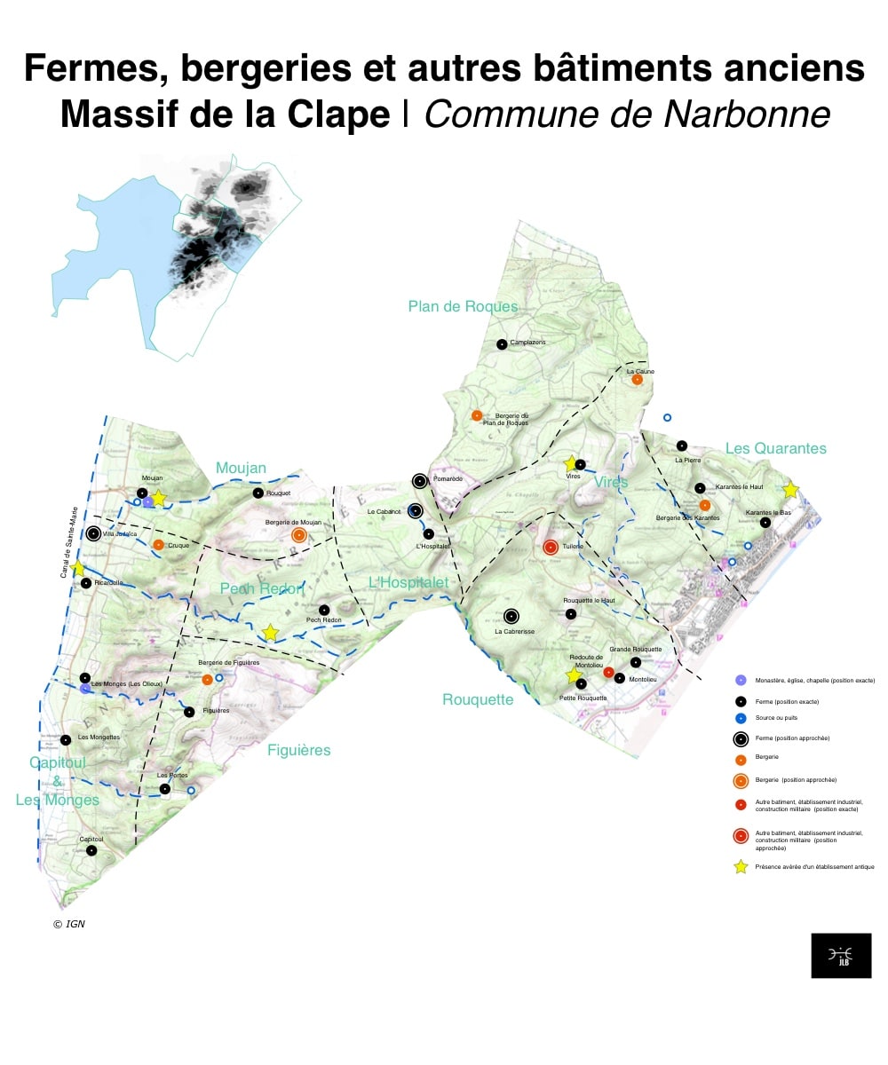 Cet inventaire des fermes, bergeries et autres bâtiments anciens, abandonnés, en ruines ou non de la commune de Narbonne dédiés à la viticulture, à l'agriculture ou au pastoralisme, donne un aperçu de l'occupation des territoires et de l'évolution au cours des siècles. La partie concernée du massif se situe entre le canal de Sainte-Marie à l'Est et la mer à l'Ouest.