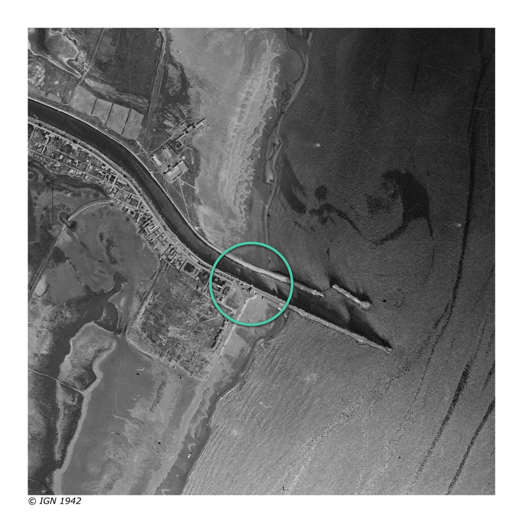 La redoute de la Haute Franqui: Vue sur la rade et le grau de la Franqui (vers 1980)